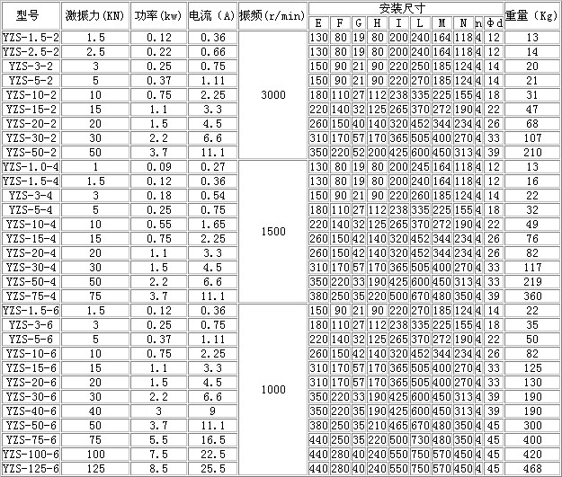 YZS/YZD系列振動(dòng)電機(jī)技術(shù)參數(shù)